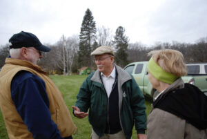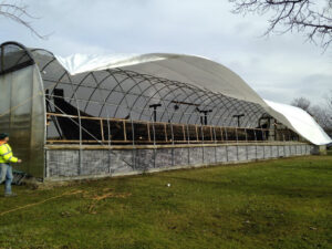 After the new cover was rolled out for installation it was discovered that the new cover was cut too short to span the shelter. The fabric is always supplied with sufficient additional material to allow it to be pulled taut over the ribs and trimmed to fit. Co-Chief Perry Straw was taking movies of the work and noted that there was a problem and commented “I hope this guy is a Boy Scout!” referring to the resourcefulness of Robert Adolph. This proved to be the case, as this capable leader sent a part of the crew to Lisle where “MGC” was constructing some new greenhouses to obtain a substitute cover. While not made with as durable a material, the substitute cover will provide sufficient protection for more than a year and has the advantage of being seamless.