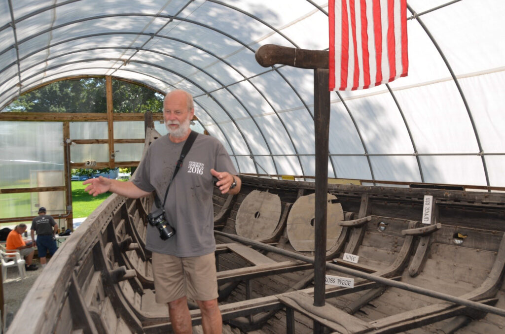 It is with great joy that it can be reported that the main stabilization work on Viking is finished! With the visit to our ship by our primary consultant Gunnar Eldjarn in August, 2016–first to evaluate the work that had been done and then make recommendations for how to proceed–we made our final plans and carried out their implementation. It was especially gratifying to hear Gunnar as he inspected the new “pillows” providing a cushion between the metal support jacks and the ship, proclaiming them either “very good” or “excellent.” Gunnar agreed that we could use the screwjack idea for both the bow and stern supports, though the bow jack could be less robust to minimize its visual impact, and said that where the jack touches the keel there needs only to be four inches of material to provide adequate support. Gunnar also agreed that getting the mast off the ground and on display supported by the ships cradle made good sense and thought that having the yard alongside the mast would be helpful. He commented on our two tone color scheme of gray below and black above and how it complements the ship, and was pleased to hear that we would be soon completing what remained unpainted.